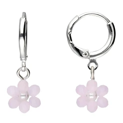 Femininer Ohrschmuck mit Zierperle und Glassteinen, die eine Blumen bilden. Die edle Huggie-Creole kann sowohl einzeln als auch kombiniert im Earcandy-Stil getragen werden. Durch die hochwertige Versilberung bekommt der Ohrschmuck den letzten Schliff verpasst.