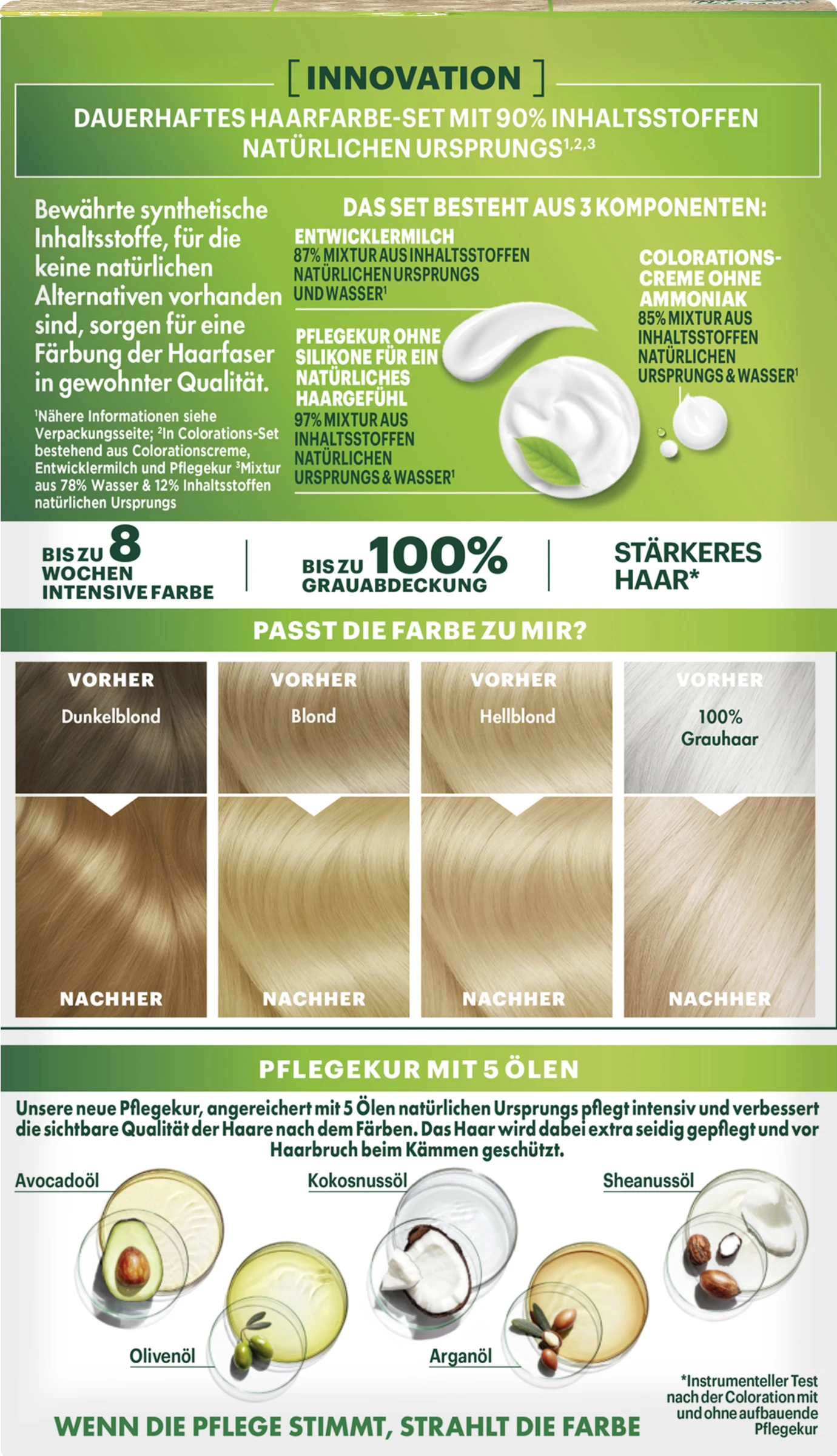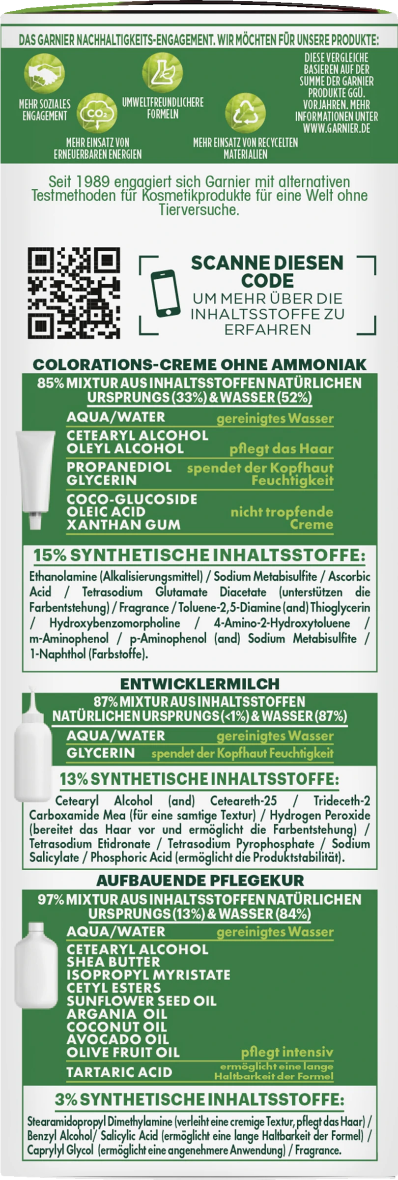 Colorationscreme: “AQUA / WATER • CETEARYL ALCOHOL • ETHANOLAMINE • GLYCERIN • PROPANEDIOL• OLEIC ACID • OLEYL ALCOHOL • COCO-GLUCOSIDE •4-AMINO-2-HYDROXYTOLUENE • p-AMINOPHENOL • m-AMINOPHENOL • ASCORBICACID • SODIUM METABISULFITE • HYDROXYBENZOMORPHOLINE • THIOGLYCERIN •TOLUENE-2,5-DIAMINE • XANTHAN GUM • 1-NAPHTHOL • TETRASODIUM GLUTAMATEDIACETATE • PARFUM / FRAGRANCE. “Entwicklermilch oder -creme: “AQUA / WATER • HYDROGEN PEROXIDE • CETEARYL ALCOHOL • SODIUM SALICYLATE •TRIDECETH-2 CARBOXAMIDE MEA • PHOSPHORIC ACID • CETEARETH-25 • TETRASODIUMETIDRONATE • TETRASODIUM PYROPHOSPHATE • GLYCERIN. “Pflegekur: “AQUA / WATER • CETEARYL ALCOHOL • STEARAMIDOPROPYL DIMETHYLAMINE • ISOPROPYLMYRISTATE • CETYL ESTERS • HELIANTHUS ANNUUS SEED OIL / SUNFLOWER SEED OIL •PARFUM / FRAGRANCE • OLEA EUROPAEA FRUIT OIL / OLIVE FRUIT OIL • ARGANIA SPINOSAKERNEL OIL • ROSMARINUS OFFICINALIS LEAF EXTRACT / ROSEMARY LEAF EXTRACT • COCOSNUCIFERA OIL / COCONUT OIL • PERSEA GRATISSIMA OIL / AVOCADO OIL • BUTYROSPERMUMPARKII BUTTER / SHEA BUTTER • CAPRYLYL GLYCOL • CITRIC ACID • TARTARIC ACID •TOCOPHEROL • SALICYLIC ACID • LINALOOL • BENZYL ALCOHOL. “