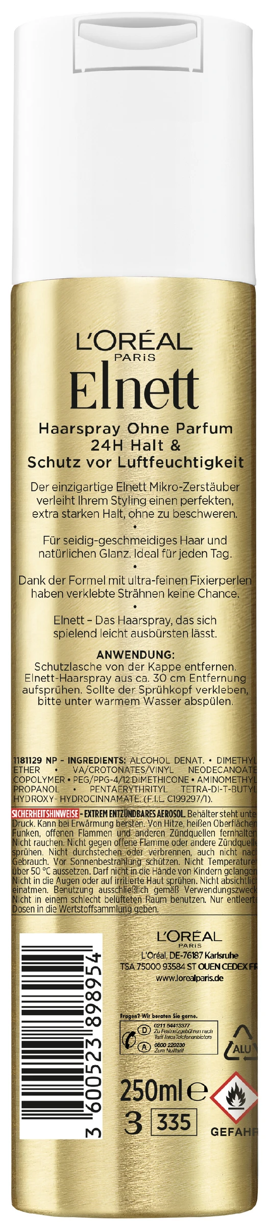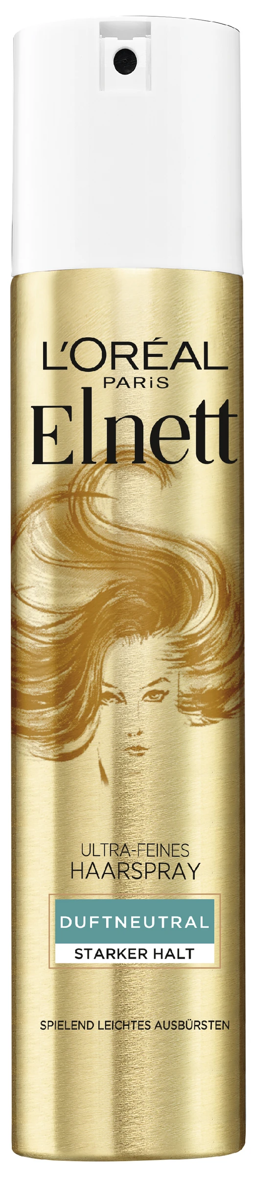 Schutzlasche von der Kappe entfernen. Elnett-Haarspray aus ca. 30 cm Entfernung aufsprühen. Sollte der Sprühkopf verkleben, bitte unter warmem Wasser abspülen.