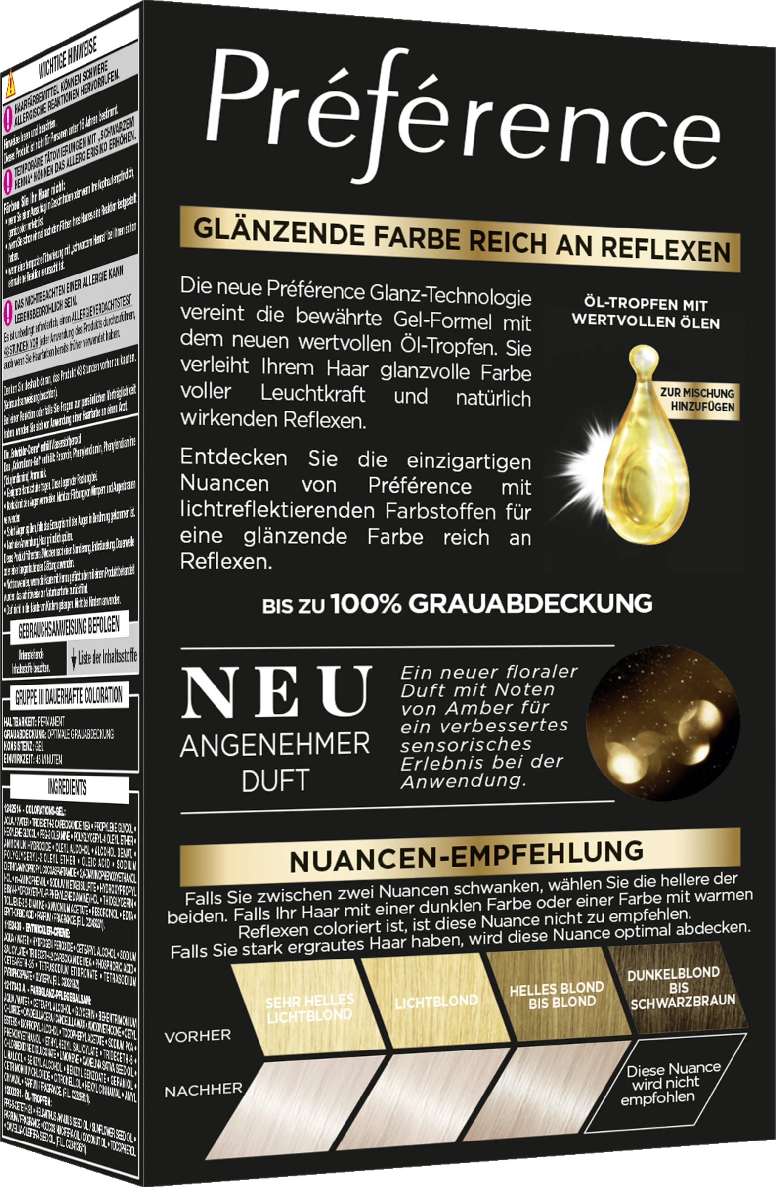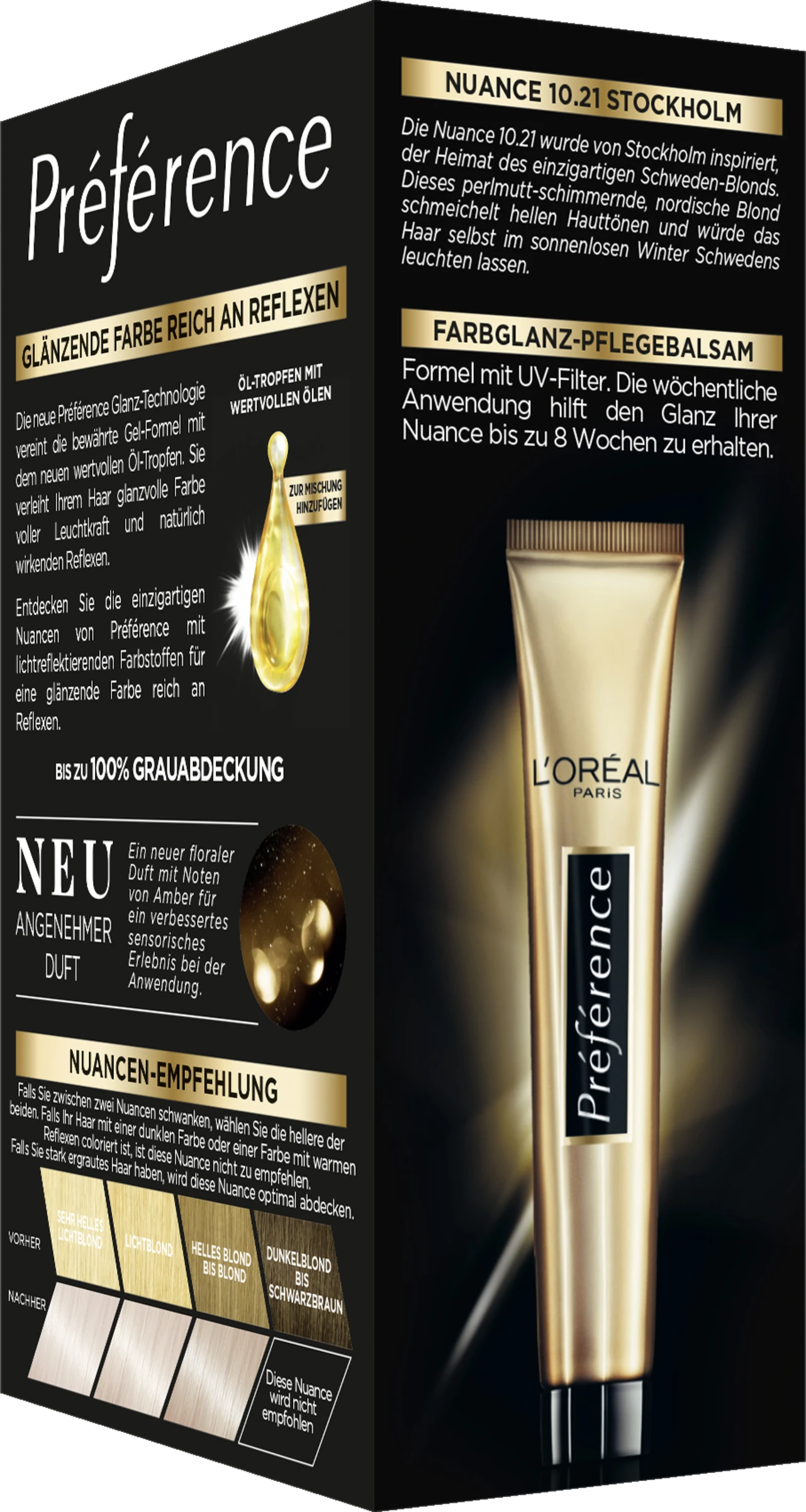 Die neue Préférence Glanz-Technologie vereint die bewährte Gel-Formel mit dem neuen wertvollen Öl-Tropfen. Sie verleiht Ihrem Haar glanzvolle Farbe voller Leuchtkraft und natürlich wirkenden Reflexen. Entdecken Sie die einzigartigen Nuancen von Préférence mit lichtreflektierenden Farbstoffen für eine glänzende Farbe reich an Reflexen.