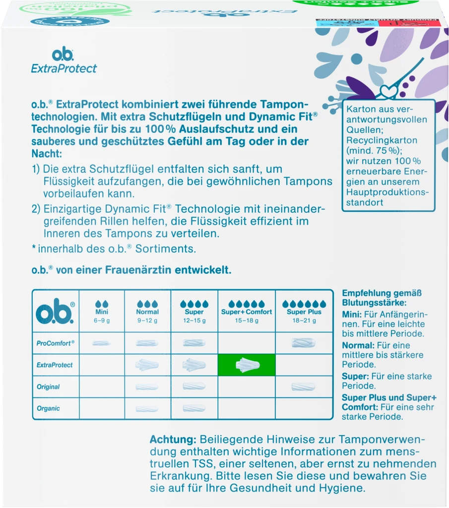 Die o.b. ExtraProtect Super+ Comfort Tampons für eine sehr starke Periode kombinieren 2 führende Tampontechnologien und bieten besonderen Auslaufschutz. Die extra Schutzflügel entfalten sich sanft, um Flüssigkeit aufzufangen, die bei gewöhnlichen Tampons vorbeilaufen kann. Die einzigartige Dynamic Fit™ Technologie mit ineinandergreifenden Rillen hilft die Flüssigkeit effizient im Inneren des Tampons zu verteilen. Zudem sind die Tampons gynäkologisch getestet, enthalten einen 100% pflanzlich basierten Tamponkern und sind frei von schädlichen Chemikalien (z.B. Pestizide), Chlorbleiche und Parfüm.
