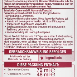 Haarfärbemittel können schwere allergische Reaktionen hervorrufen. Bitte folgende Hinweise lesen und beachten: Dieses Produkt ist nicht für Personen unter 16 bestimmt. Temporäre Tätowierungen mit „schwarzem Henna“ können das Allergierisiko erhöhen.