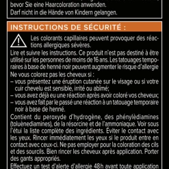 Haarfärbemittel können schwere allergische Reaktionen hervorrufen. Bitte folgende Hinweise lesen und beachten: Dieses Produkt ist nicht für Personen unter 16 Jahren bestimmt. Temporäre Tätowierungen mit „schwarzem Henna“ können das Allergierisiko erhöhen. Färben Sie Ihr Haar nicht, – wenn Sie einen Ausschlag im Gesicht haben oder wenn Ihre Kopfhaut empfindlich, gereizt oder verletzt ist; – wenn Sie schon einmal nach dem Färben Ihrer Haare eine Reaktion festgestellt haben; – wenn eine temporäre Tätowierung mit „schwarzem Henna“ bei Ihnen schon einmal eine Reaktion verursacht hat. Enthält Wasserstoffperoxid. Vollständige Inhaltsstoffdeklaration siehe Packungsboden. Kontakt mit den Augen vermeiden. Sofort Augen spülen, falls das Erzeugnis mit den Augen in Berührung gekommen ist. Die vollständigen Warnhinweise entnehmen Sie bitte der Verpackung.
