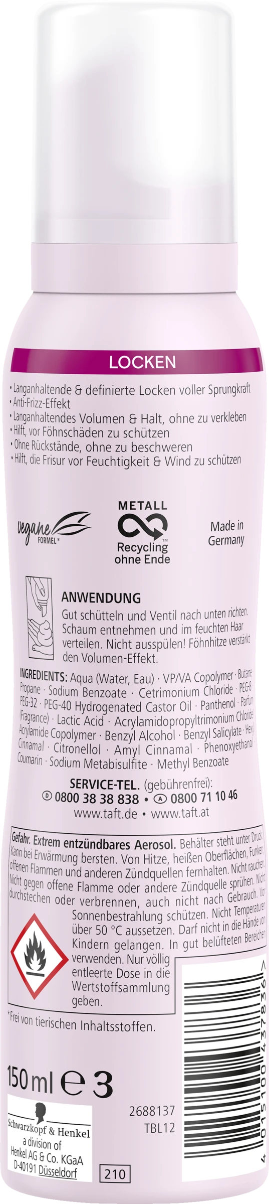 Der Taft Locken Schaumfestiger für langanhaltende und definierte Locken voller Sprungkraft – mit Anti-Frizz-Effekt. Für langanhaltenden Halt und Volumen, ohne zu verkleben, Rückstände zu hinterlassen oder das Haar zu beschweren. Ihr Haar wird sowohl vor Föhnschäden als auch vor Feuchtigkeit und Wind geschützt. Taft Schaumfestiger verwenden vegane Formeln und sind frei von tierischen Inhaltsstoffen.
