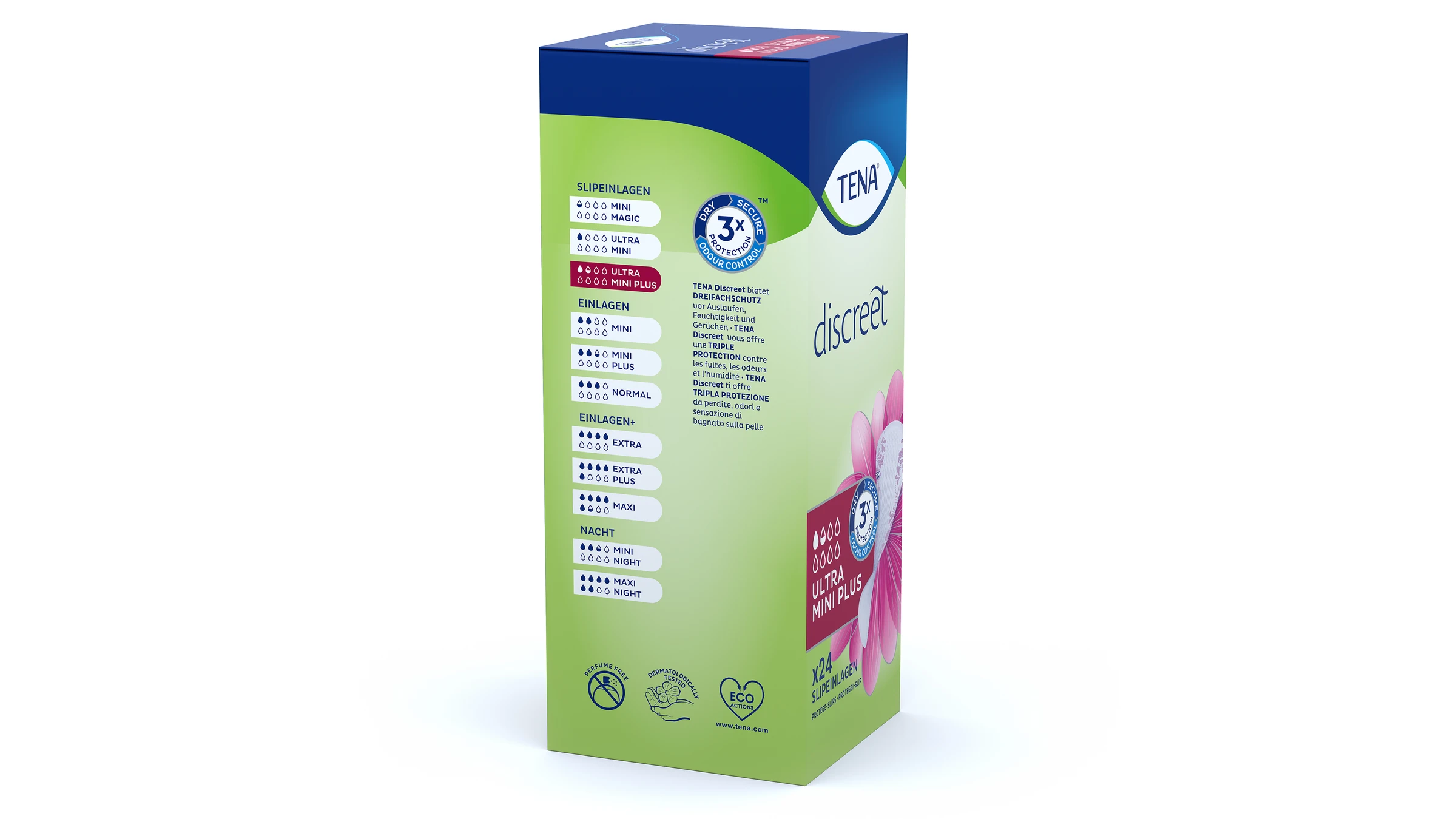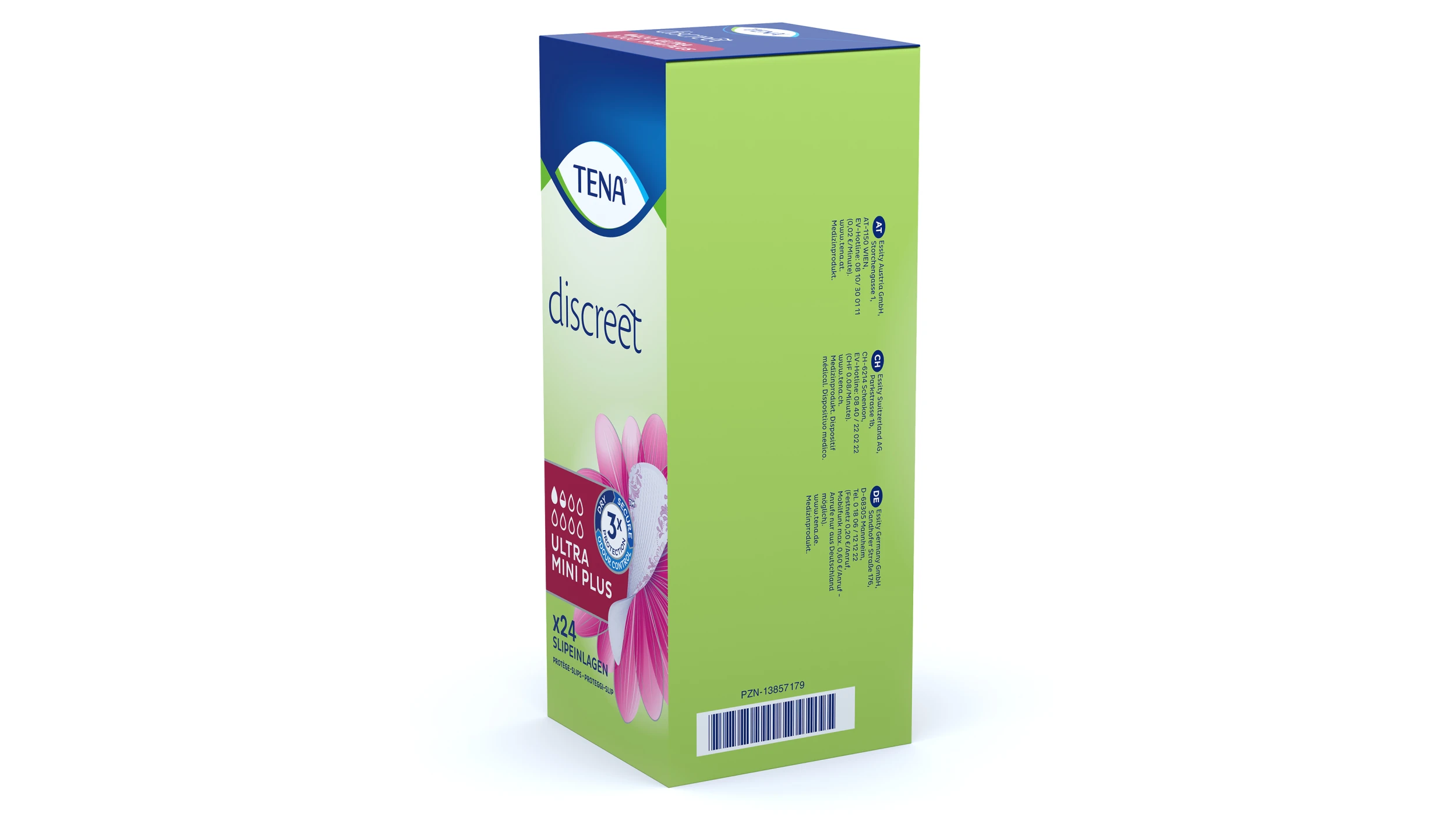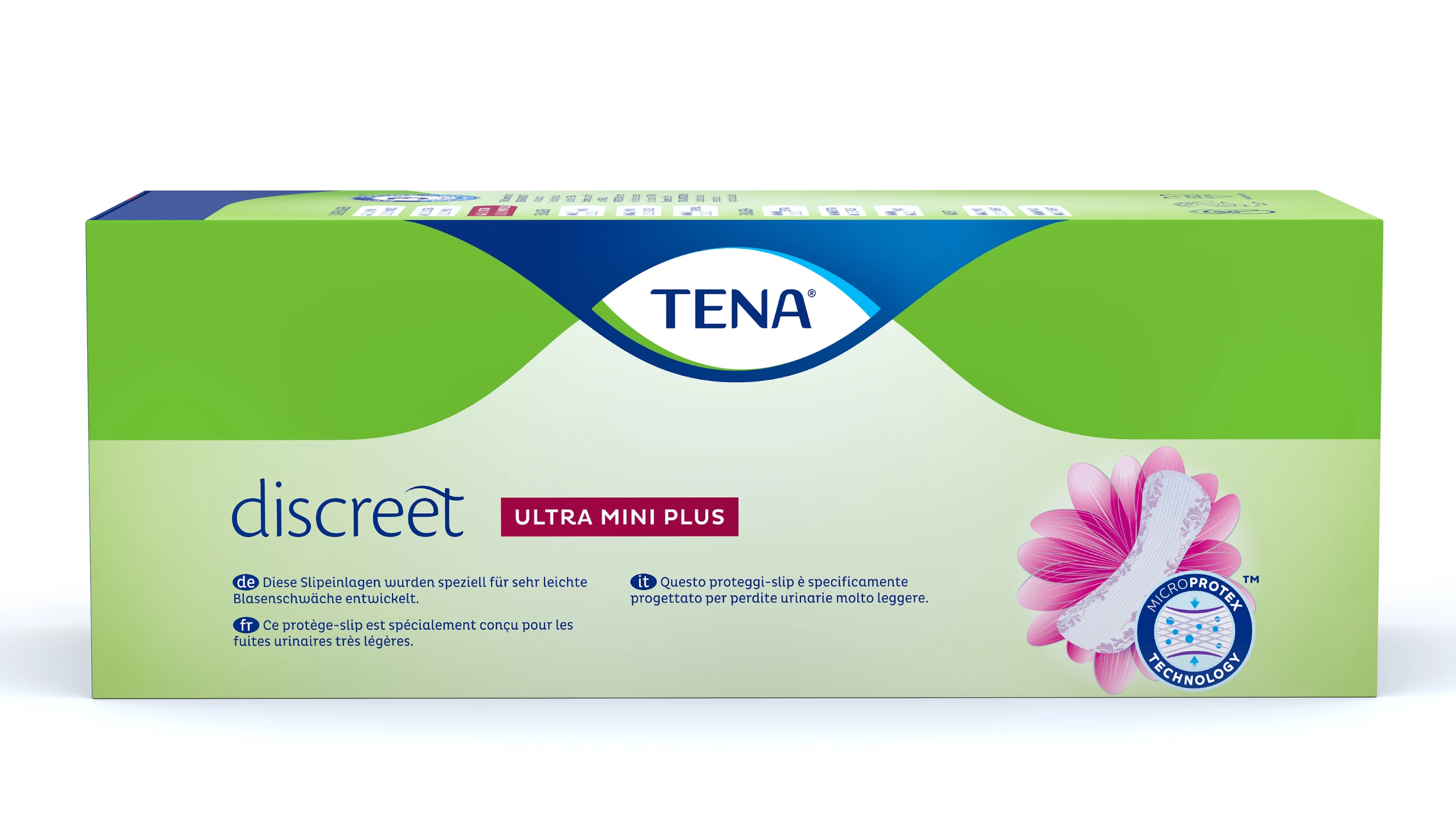 Die TENA Discreet Ultra Mini Plus ist eine extra lange Slipeinlage bei Blasenschwäche und bietet diskreten Schutz bei körperlicher Aktivität sowie bei Husten oder Niesen für Frauen mit leichter Blasenschwäche. Sie ist wesentlich saugfähiger als herkömmliche Slipeinlagen und schließt dank microPROTEX™ Technologie Gerüche und Flüssigkeit sofort ein. Weil Diskretion genauso wichtig ist wie Sicherheit.